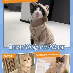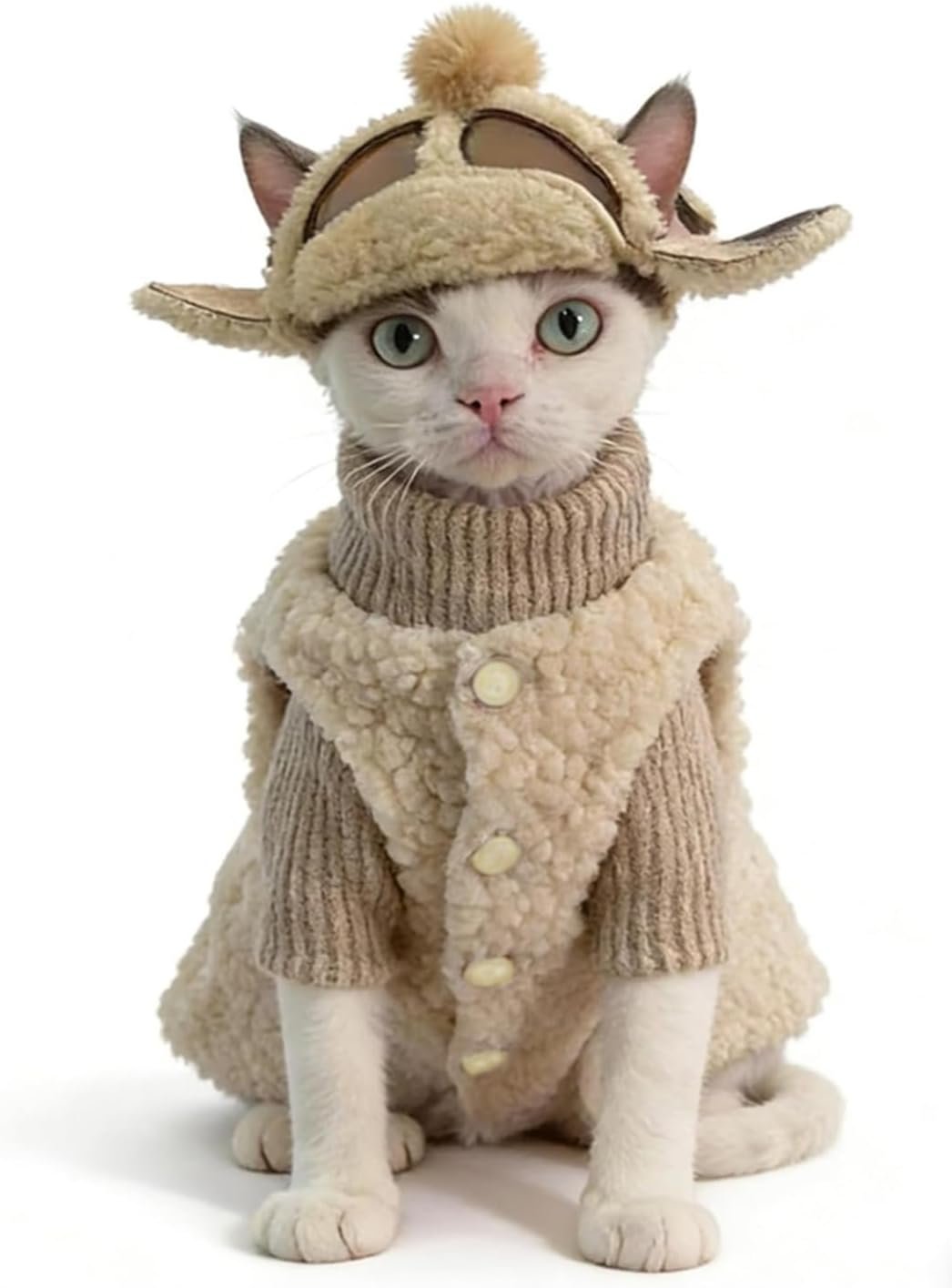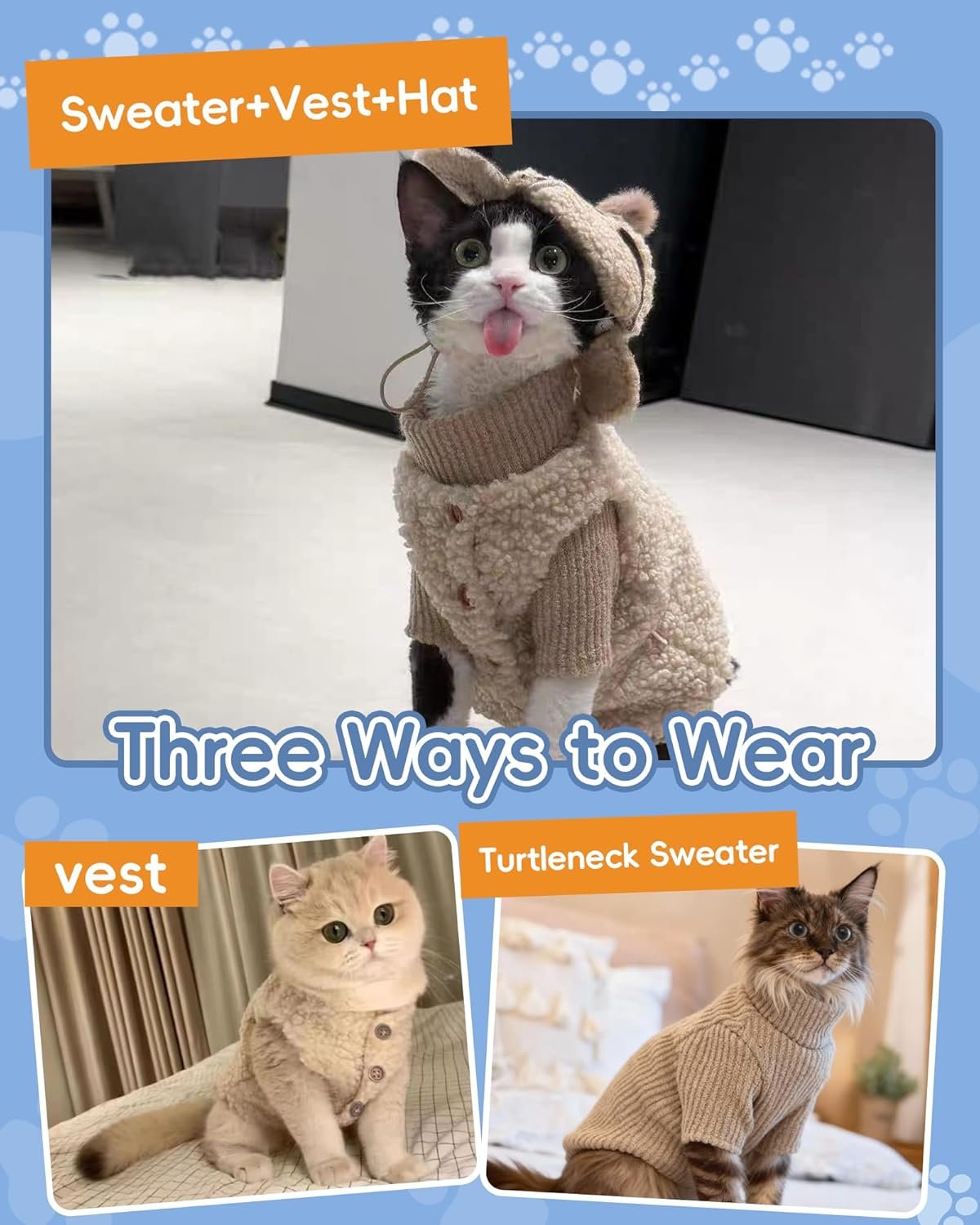 • Cat Three-Piece Set: Sweater + Vest + Hat. The sweater and vest can be worn separately.Vintage-Inspired Cozy Set for Devon Rex, Hairless Cats & Small Dogs.